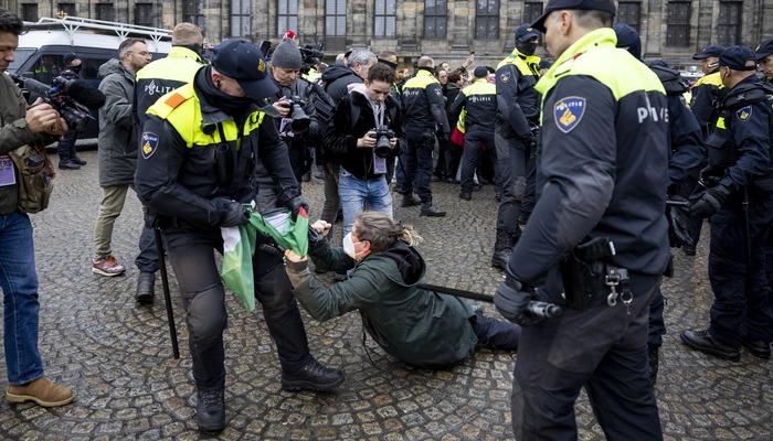 Protestocular sık sık “Özgür Filistin” ve “Amsterdam soykırıma hayır diyor” gibi sloganlar attı. Yürüyüş ve gösteri yasağı devam ederken gerçekleşen eyleme polis sert müdahale etti.