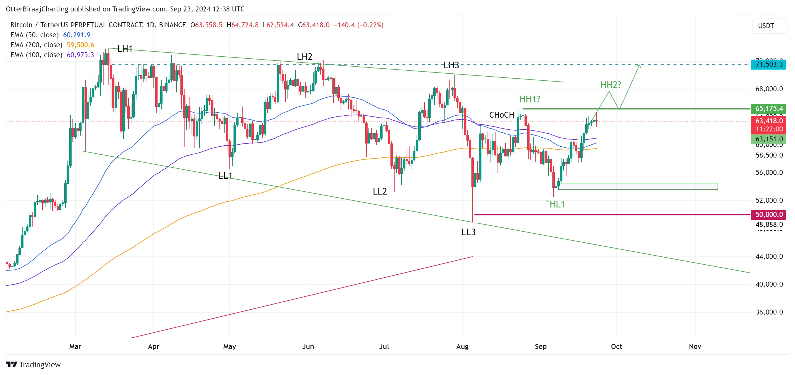 Yukarıdaki grafikte görüldüğü gibi Bitcoin, Mart 2024'ten bu yana günlük grafikte daha düşük en yüksek ve en düşük düşüşleri gerçekleştiriyor.