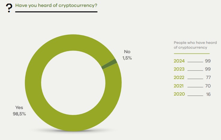 Ankete göre katılımcıların yaklaşık %99’u kripto para birimlerine aşina. Bu oran 2020'de %16'dan önemli ölçüde arttı. Kasım 2021'de 3 trilyon dolara ulaşan kripto para piyasasının değerinin artmasıyla bilinirlik 2021'de %70'e çıktı. 2022'ye gelindiğinde kripto para farkındalığı %77'ye yükseldi, ardından da %77'ye ulaştı. 2023 ve 2024'te %99.